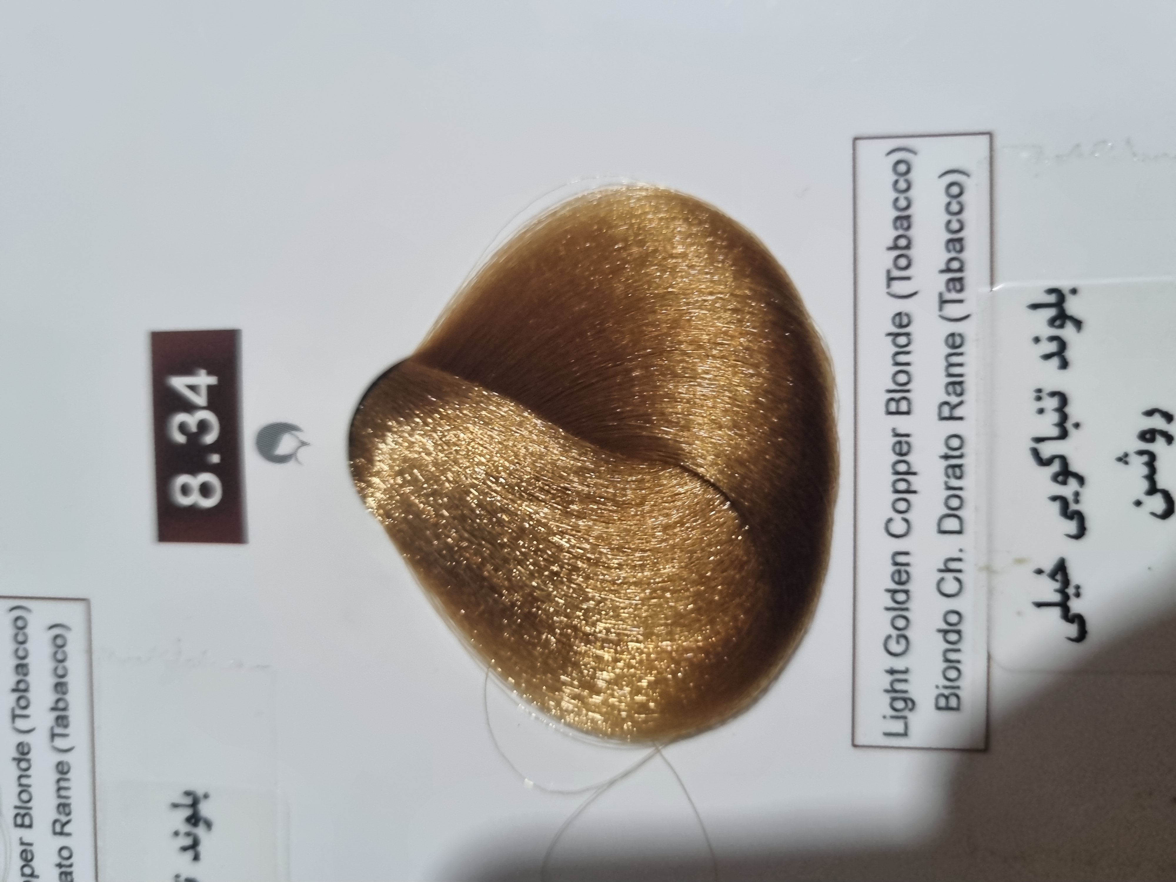 رنگمو اکیا 8/34 بلوند تنباکویی روشن با تم طلایی گلدن70% ومسی برنز 30% ی
